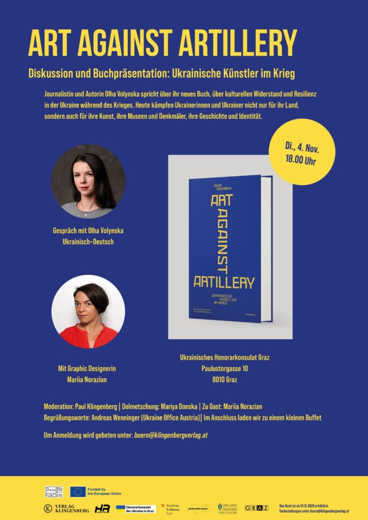 Die Veranstaltung findet am 4. November 2025 um 18:00 Uhr in der Honorarkonsulat der Ukraine in Graz statt (Paulustorgasse Buchpräsentation: „Art against Artillery“ von Olha Volynska10).